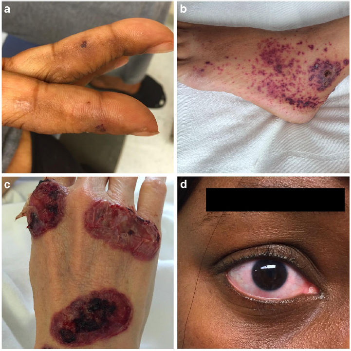 a:手指梗塞, b:下腿の紫斑, c:手背の壊疽性膿皮症, d:強膜炎